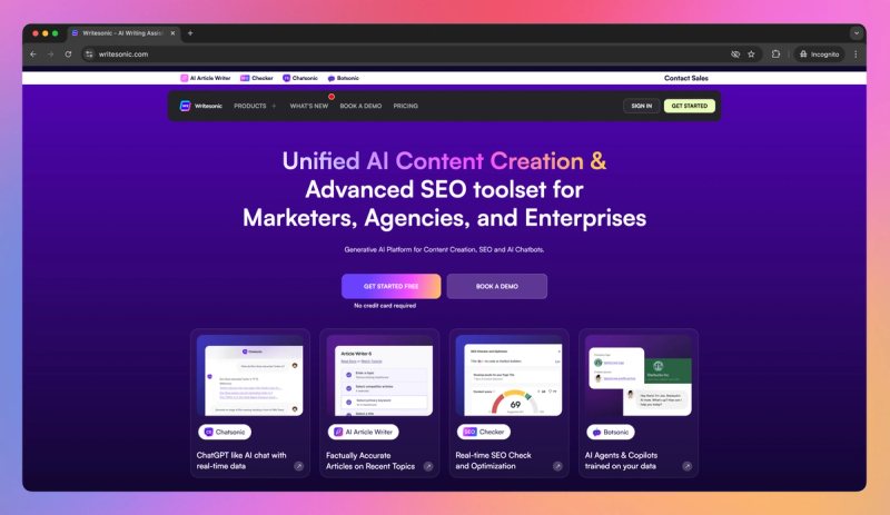 | Writesonic | Accelerating SEO Content | Flexible AI quality modes. | Free trial, affordable quality-controlled plans. |