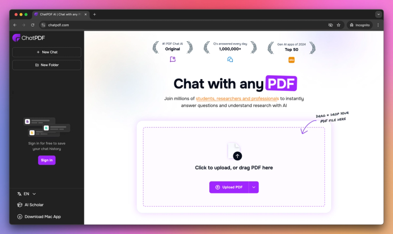 Overview: ChatPDF is an AI tool that allows you to converse with PDF documents. Think of it as "ChatGPT, but for research papers or any PDF". Launched in early 2023, ChatPDF gained a fast following among students and academics who needed a quicker way to digest lengthy readings. The concept is simple: you upload a PDF (be it an article, textbook chapter, report, etc.), and ChatPDF will analyze it and create a chat interface where you can ask questions about that document. It generates a brief summary and even some suggested questions to get you started. This addresses a huge pain point: instead of skimming page after page or using Ctrl+F blindly, you can query the document in natural language. ChatPDF's popularity soared as part of the wave of specialized ChatGPT-like tools, and it's now used by "millions of students, researchers and professionals" according to its site. In education, it has been heralded as a way to turbocharge studying and literature review.