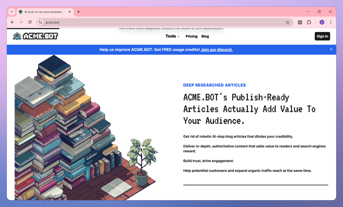 Acme Bot is an AI-powered content automation agent for SEO and Answer Engine Optimization. It conducts deep research for articles, writes publish-ready blog content, and generates custom illustrations that help content marketers and business owners dominate search rankings without hiring additional writers.
