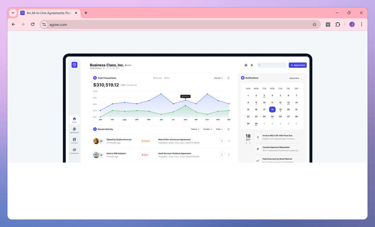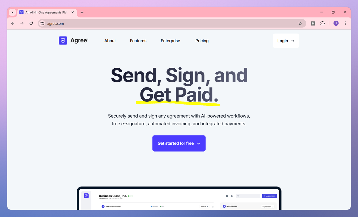 Agree.com is an all-in-one agreements platform that connects contract signing with payment processing. It provides AI-powered document workflows, free unlimited e-signatures, and automated invoicing that helps business owners collect payments up to 200% faster.