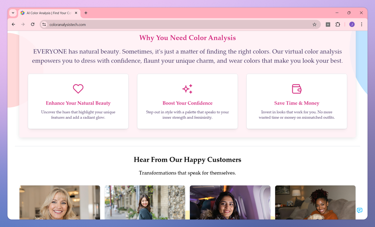 - Discover your seasonal color palette in minutes through AI-powered photo analysis instead of spending hours at in-person appointments.