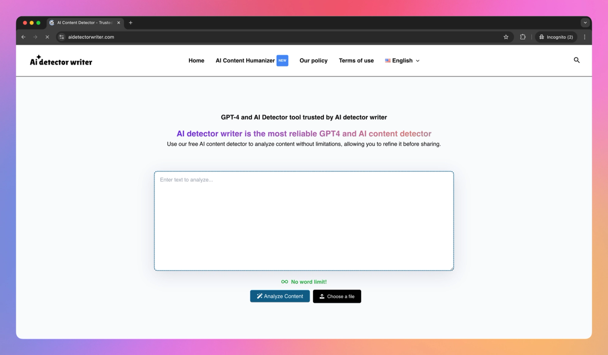 AI Detector Writer is a content analysis tool that identifies AI-generated text across multiple languages without word limits. It helps content creators, educators, and publishers verify content authenticity, maintain academic integrity, and protect brand reputation through real-time detection and detailed PDF reports.