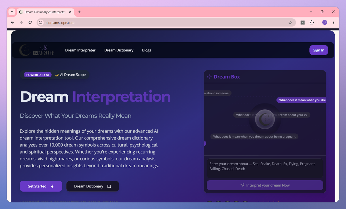 AI Dream Scope is an AI-powered dream interpretation platform that decodes the hidden meanings in your dreams through advanced pattern recognition and symbol analysis. It interprets over 10,000 dream symbols across cultural, psychological, and spiritual perspectives to help dreamers, psychology enthusiasts, and self-development seekers gain personalized insights about their subconscious mind.