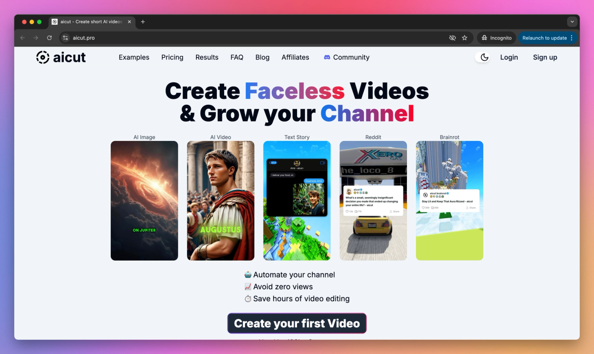 aicut is an AI-driven video automation system that turns written content into short-form videos for social media channels without showing your face on camera. It makes fake text message stories, AI image stories, and converts blog posts into videos that help content creators, news publishers, and social media managers grow their YouTube, TikTok, and Instagram channels while reducing video production time.