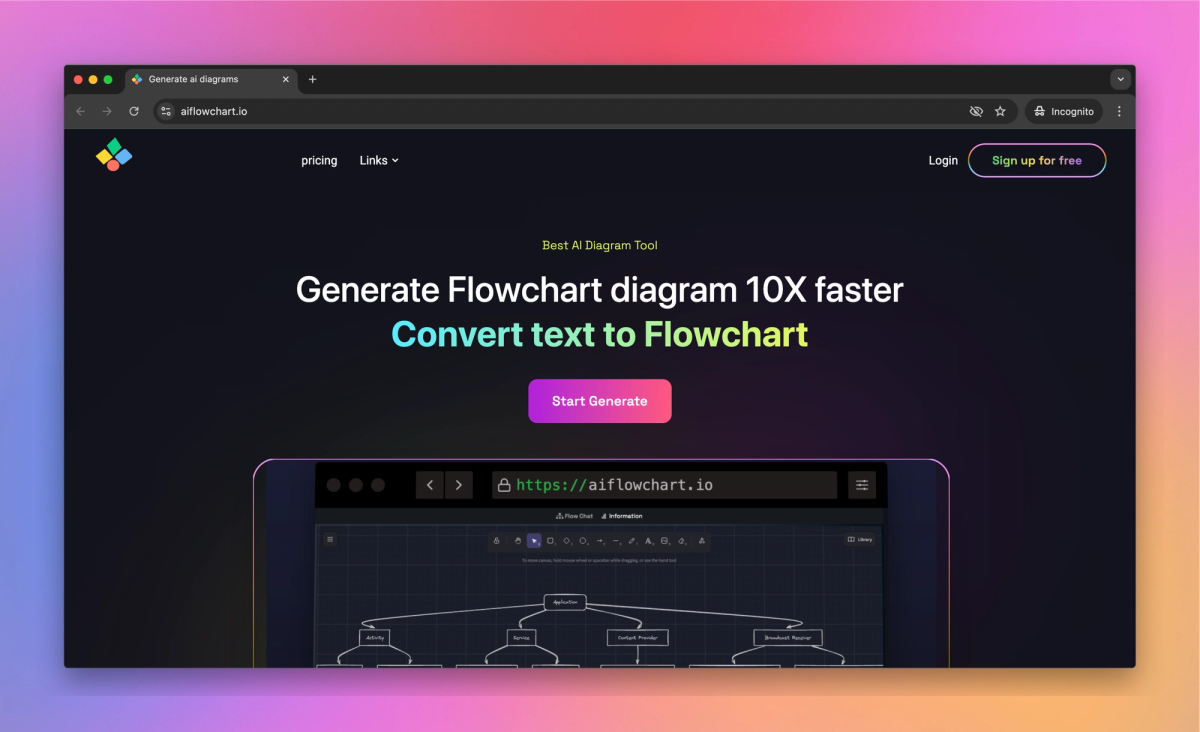 AI Flowchart is an AI-powered diagram generation tool that creates flowcharts, graphs, and sequence diagrams from text, PDFs, and blog content. It helps project managers and data analysts turn complex information into clear visual representations, saving hours of manual diagram creation time.