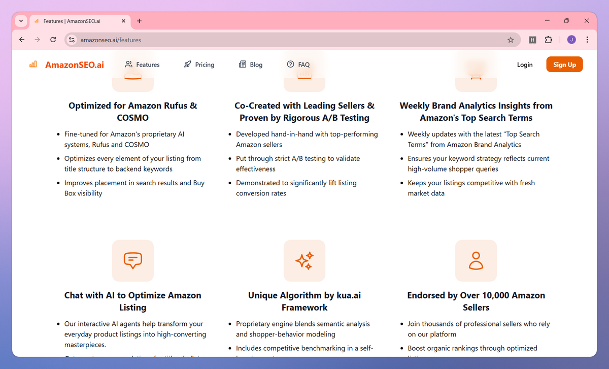 AmazonSEO.ai sets itself apart with its proprietary Kua Framework, which blends deep understanding of Amazon's COSMO algorithm with extensive A/B testing conducted alongside top-performing sellers. This co-development approach with leading Amazon merchants makes the tool particularly helpful for sellers seeking proven listing strategies that drive real results. The platform updates its keyword database weekly with fresh Amazon Brand Analytics data, keeping your product listings ahead of market trends and competitive shifts.