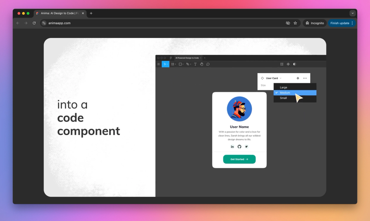 Anima converts Figma designs into React, HTML, and Vue code, automating front-end development for product teams. This design-to-code tool generates developer-friendly code that speeds up production, allowing designers and developers to focus on creating user interfaces.