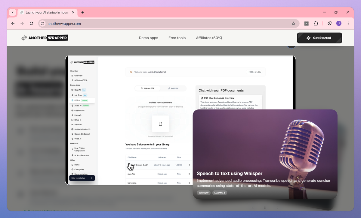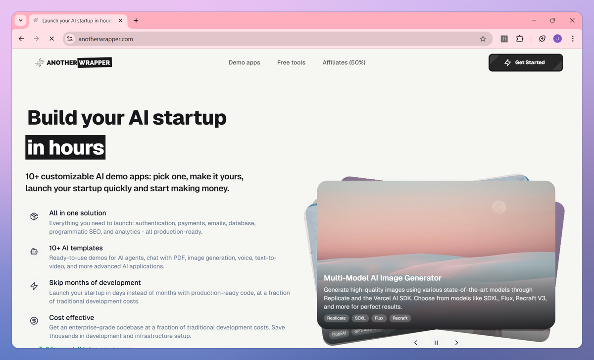 AnotherWrapper is a Next.js AI development toolkit for building AI applications. It provides ready-to-use demo apps, integrates multiple AI models from providers like OpenAI and Anthropic, and includes complete infrastructure with authentication and payments to help developers launch AI products in hours.