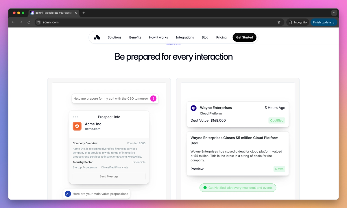 Aomni is an AI agent platform for B2B sales teams that conducts account research and develops data-driven strategies. It equips account executives with personalized AI agents for call preparation, allowing them to close larger deals and accelerate their career growth.