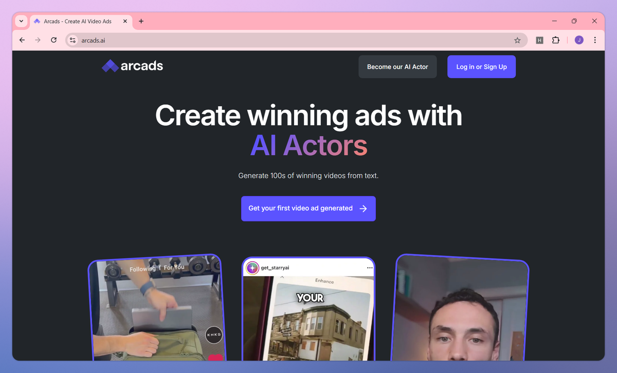 Arcads is an AI-powered video ad generator that creates realistic advertisements using virtual actors. It converts text into professional video ads, offers 300+ AI actors for different demographics, and generates multiple ad variations simultaneously to help performance marketers and ad creators produce high-quality content without hiring real actors or booking studio time.