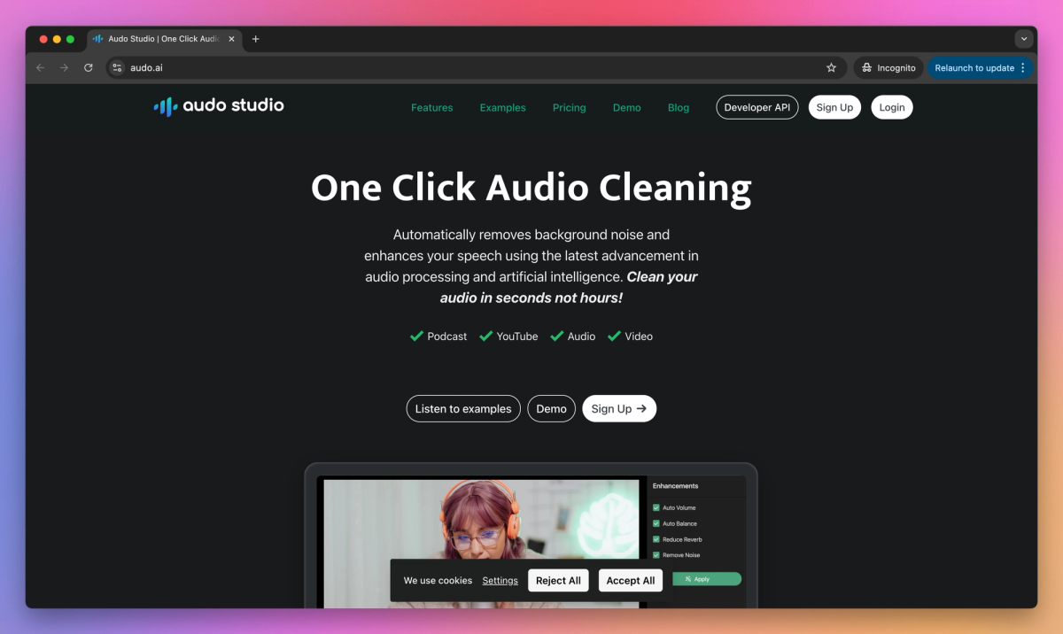 Audo Studio is an AI-powered audio cleaning tool that removes unwanted background noise, adjusts volume levels, and cleans up sound quality for podcasters, YouTubers, and online course creators. The tool eliminates common audio issues like barking dogs, traffic sounds, and room echoes with two clicks, allowing content creators to record from any location while maintaining professional sound quality.