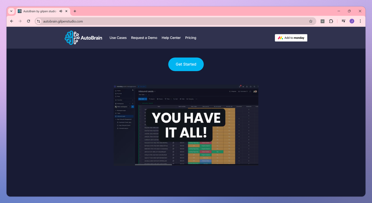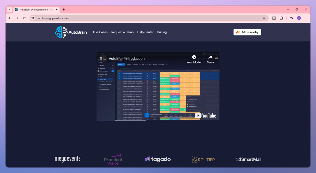 AutoBrain is an AI-powered prediction tool designed for monday.com CRM. It automates lead scoring from historical data, predicts customer churn via at-risk account identification, and prioritizes urgent support tickets to help Sales, Marketing, and Support teams identify promising opportunities, retain customers, and refine service delivery.