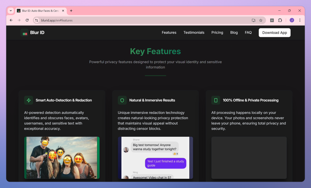 Blur ID is an AI-powered privacy protection app that automatically detects and obscures faces and sensitive information in photos and screenshots. It identifies and applies natural-looking blur effects to faces, avatars, usernames, and confidential text in your images to help social media users, professionals, and parents maintain privacy when sharing content online.