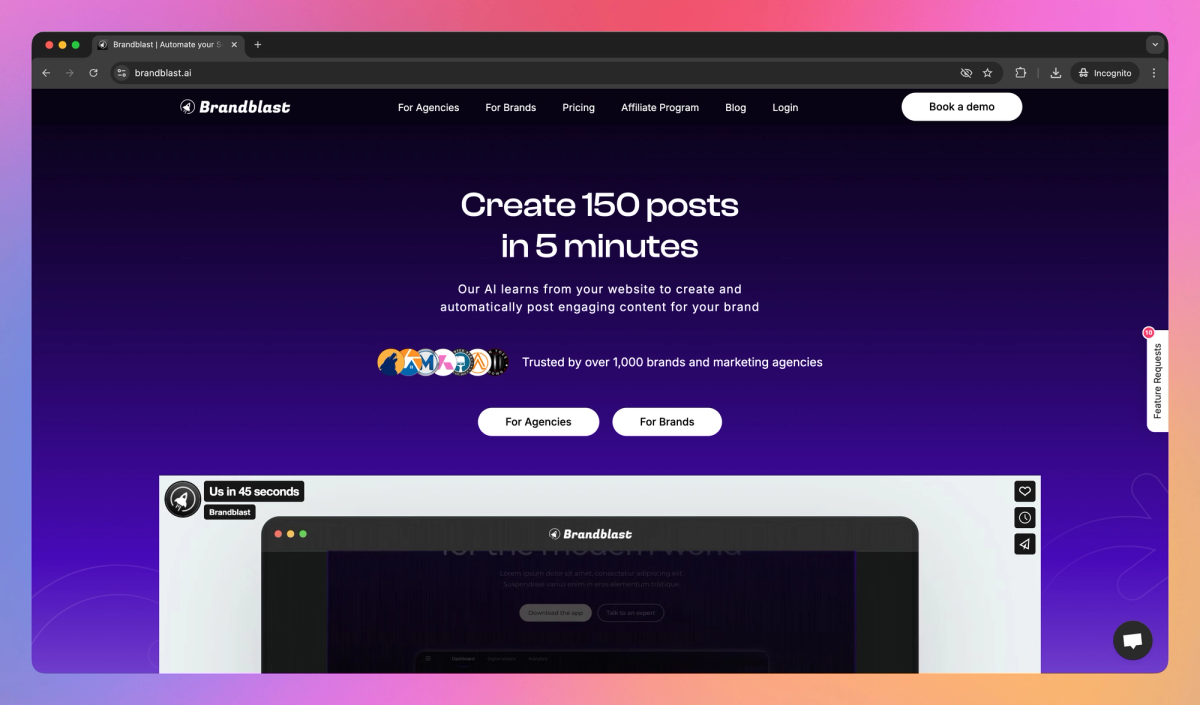 Brandblast.ai creates social media posts by analyzing a brand's website and generating content that matches their voice. Marketing agencies can use this tool to produce multiple posts for their clients' accounts and schedule them for automatic publishing.