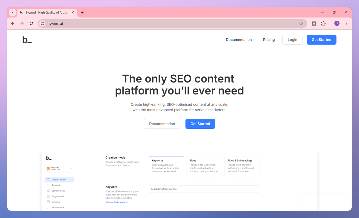 Byword is an AI content creation platform that generates SEO-optimized articles at scale. It automates keyword research through SERP analysis, produces complete articles with proper structure, and publishes directly to your CMS with automatic formatting and image generation to help content marketers and SEO teams create high-ranking content while reducing production costs.