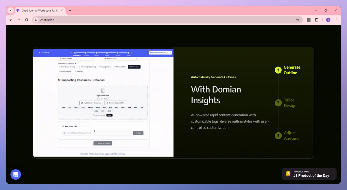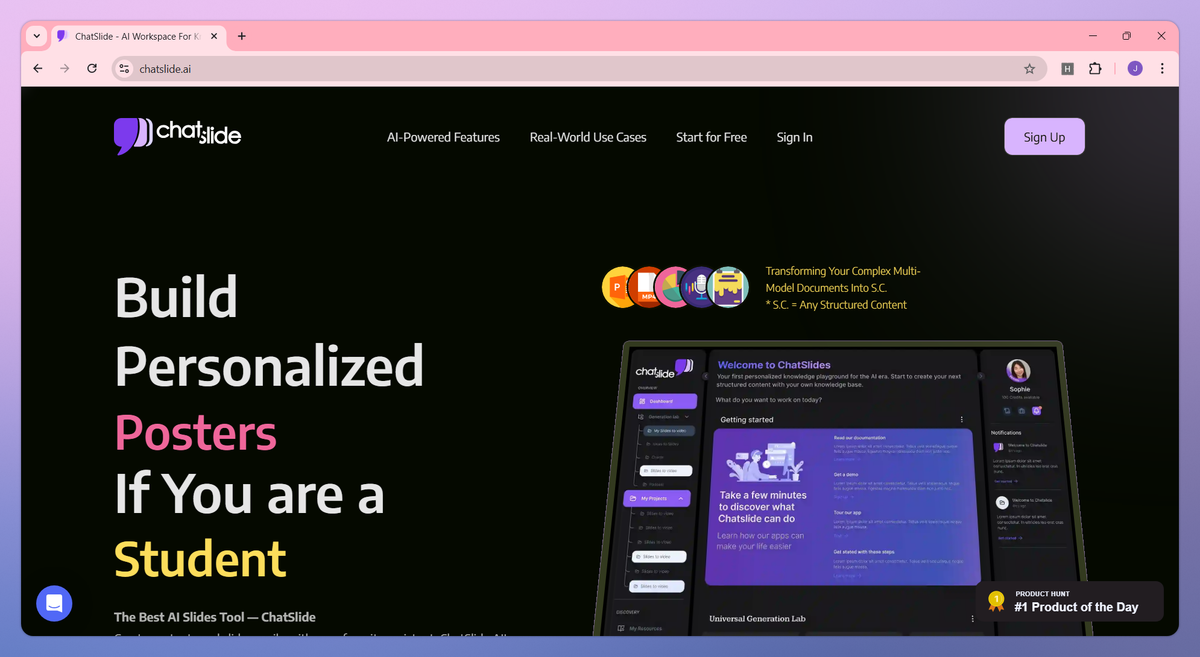 ChatSlide distinguishes itself with multi-modal document support that connects knowledge across PDFs, research papers, and various file types for deeper understanding and more coherent presentations. The ChatSlide Bot allows educators and healthcare professionals to make real-time adjustments to content structure and design with simple conversational commands. Medical practitioners and business consultants particularly value the personalized voice cloning feature, which lets them deliver presentations in their own voice for a more authentic connection with their audience.