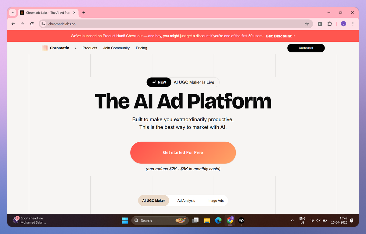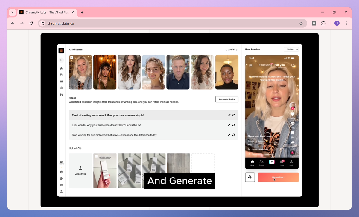 Chromatic Labs is an AI ad platform that generates video UGC in 60 seconds, extracts insights from campaign data in minutes, and converts raw product images into ads. This platform helps marketers, founders and agencies reduce their ad production time from weeks to seconds while lowering monthly costs by $2,000-$5,000.