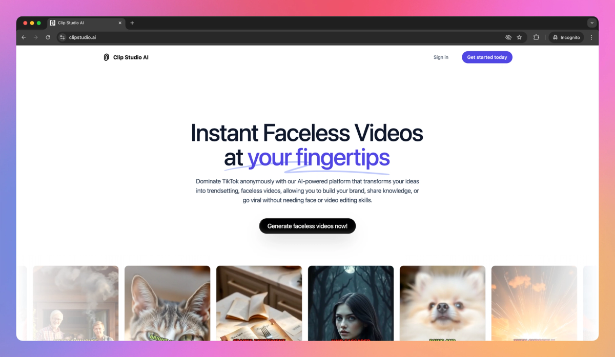 Clip Studio AI is an AI-powered platform that transforms ideas into faceless videos for TikTok. It enables content creators to produce trendsetting clips, build their brand, and share knowledge without appearing on camera or needing video editing expertise.
