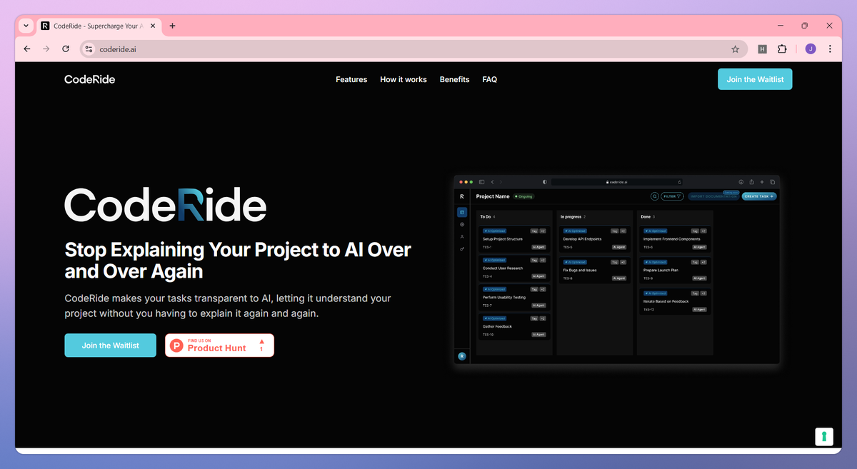 CodeRide is an AI-powered task management tool for coding projects that gives AI assistants full visibility of your entire codebase. It adds optimized context to each coding task, automates prompt generation, and tracks AI progress through a Kanban system to help developers complete projects without repeatedly explaining their code structure.