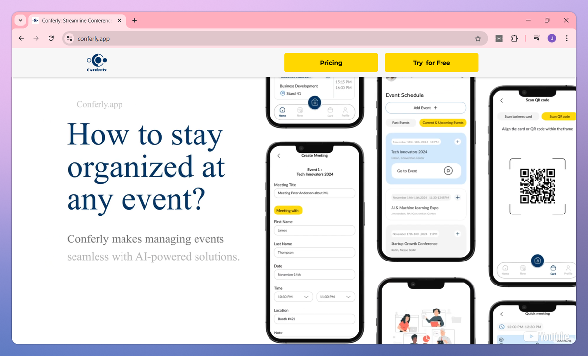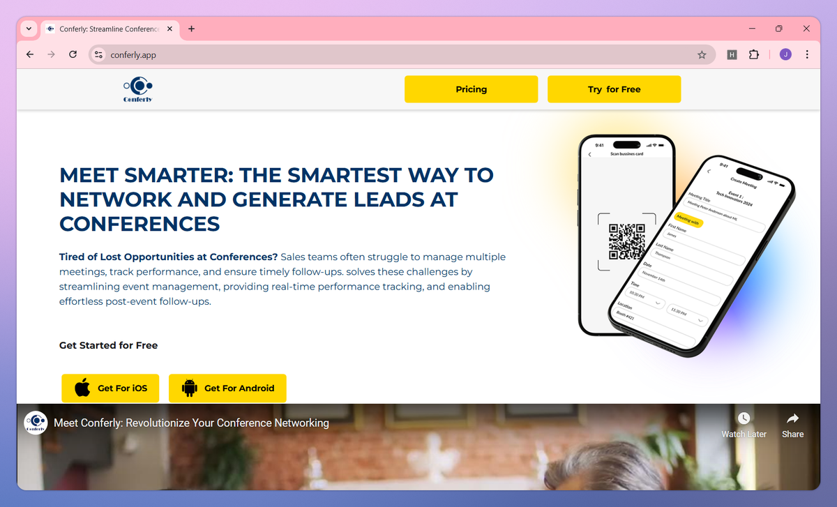 Conferly is an AI-powered conference networking tool designed for sales teams and event professionals. It records and summarizes meetings, scans business cards directly to your CRM, and tracks team performance metrics to help sales managers maximize conference productivity and follow-up rates.