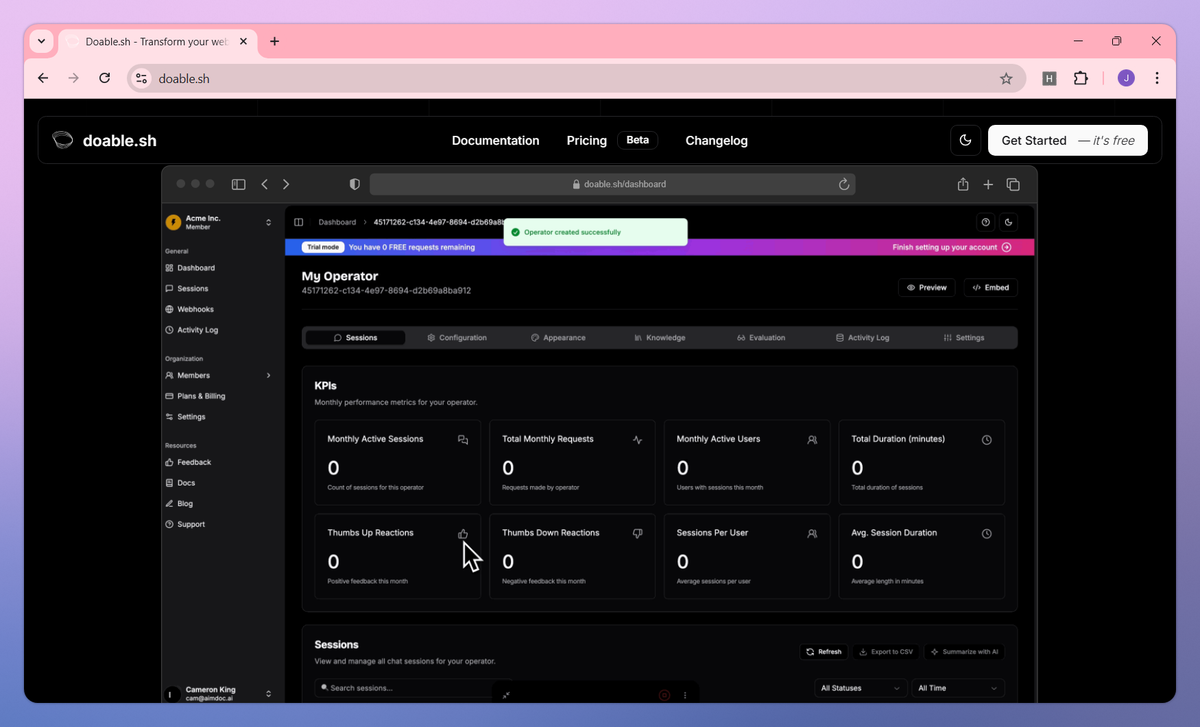 Doable.sh is an AI integration tool that embeds operators into web applications to automate user tasks. It converts multi-step processes into natural language commands, fills forms based on user intent, and creates context-aware links that trigger workflows to help web developers and product managers improve user activation and retention rates.