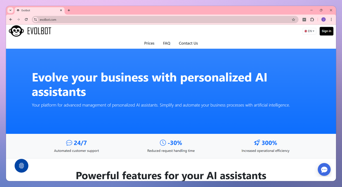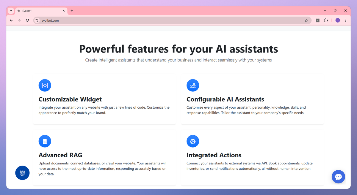 Evolbot is a SaaS platform for creating and integrating customizable AI chatbots and AI agents for business automation. It uploads company documents to train chatbots using RAG technology, connects with external systems like CRMs and databases through API integrations, and provides customizable widgets that embed on websites with simple HTML code. Business owners, customer service managers, and marketing teams use Evolbot to automate customer support conversations, manage appointment bookings, and generate qualified leads across e-commerce, financial services, and hospitality industries.