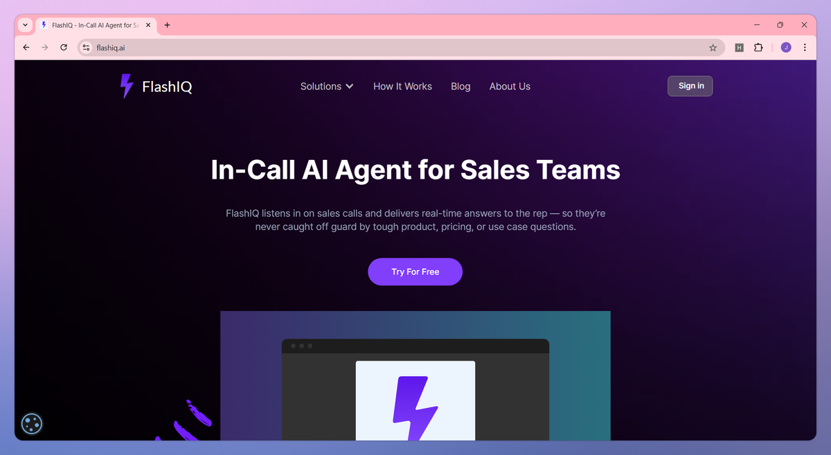 FlashIQ is an in-call AI agent for sales teams that answers tough product, pricing, and use case questions in real-time during meetings. It delivers accurate information sourced from your company knowledge base, eliminates the need to say "I'll get back to you," and helps sales reps close more deals by maintaining momentum in customer conversations.
