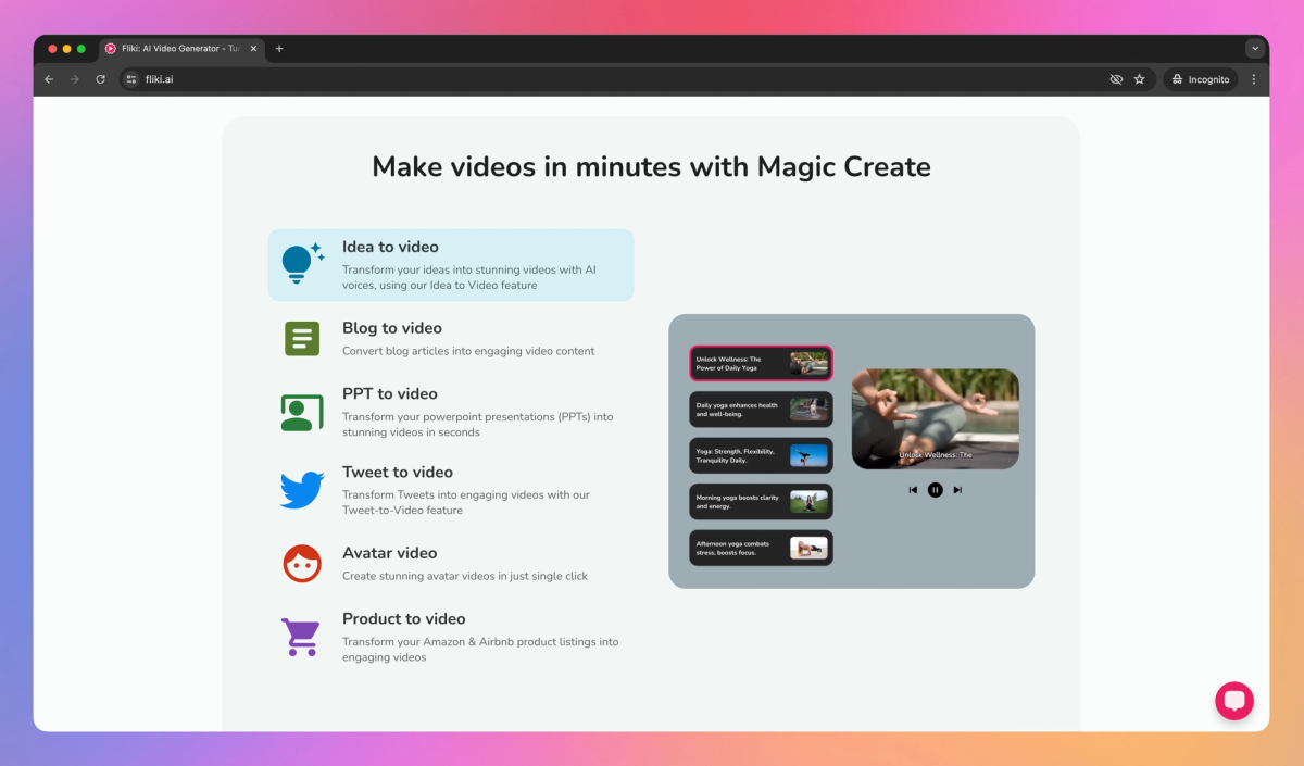 - Generate videos from prompts, with AI creating scripts and selecting relevant media.