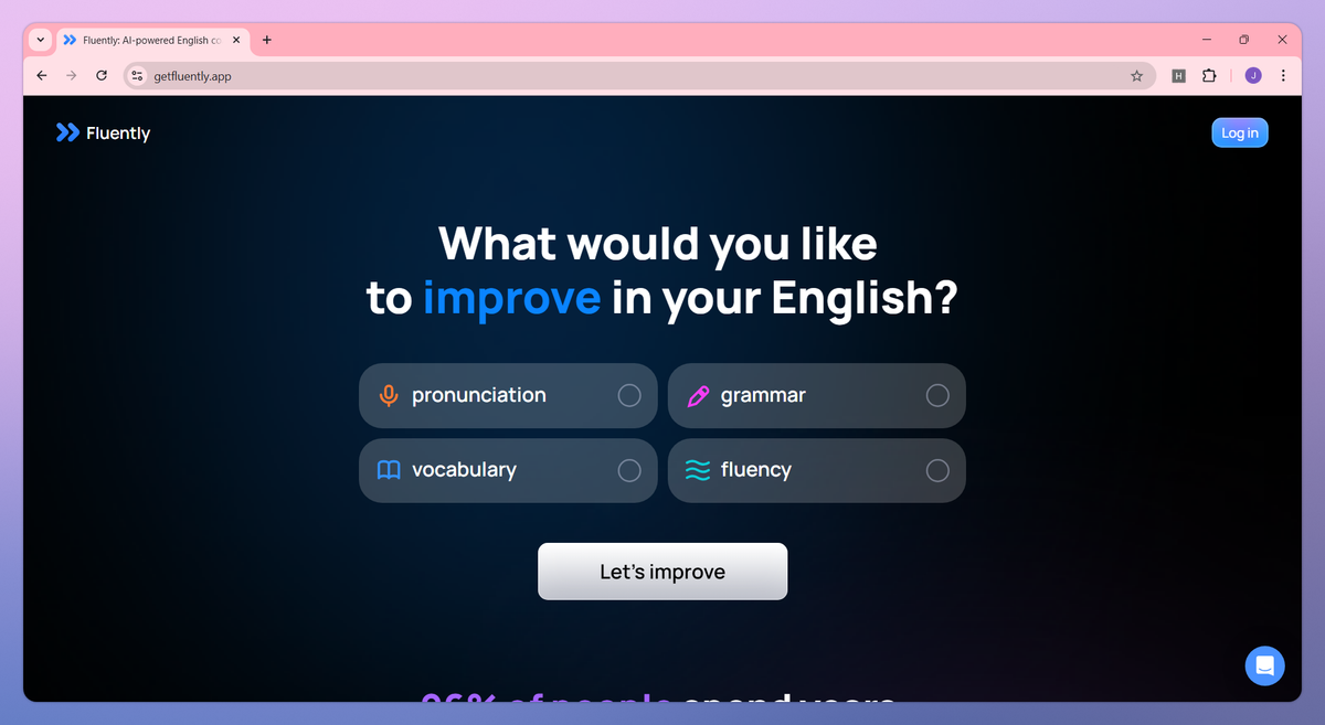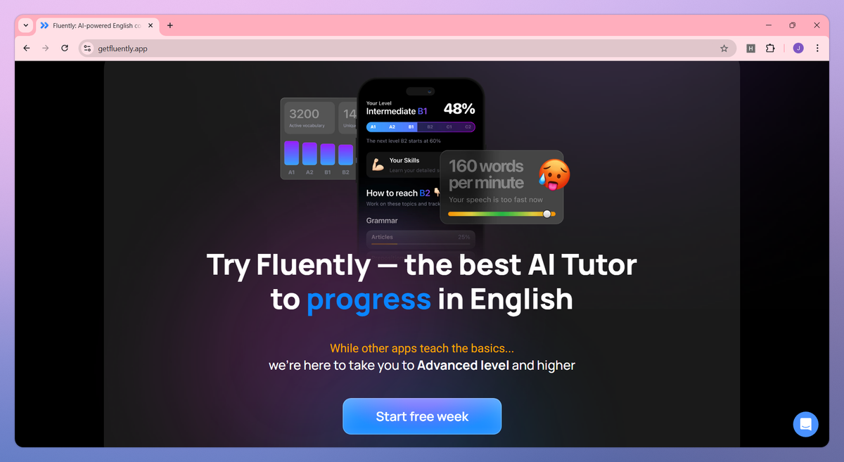 Fluently is an AI-powered English coach that helps non-native speakers progress to advanced fluency levels. It assesses your current English proficiency, creates personalized improvement programs based on your specific mistakes, and provides speaking practice on practical topics like job interviews, meetings, and sales calls while giving real-time feedback on your grammar, pronunciation, and vocabulary.