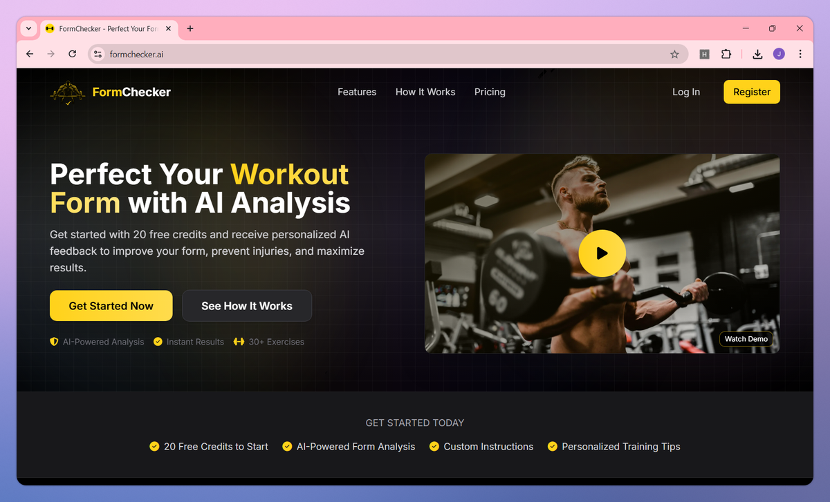 FormChecker is an AI-powered workout form analyzer that examines your exercise technique through short video clips. It tracks 33 body landmarks to measure joint angles and movement patterns, provides personalized feedback on your technique, and supports over 30 different exercises to help fitness enthusiasts and athletes prevent injuries and achieve better training results.
