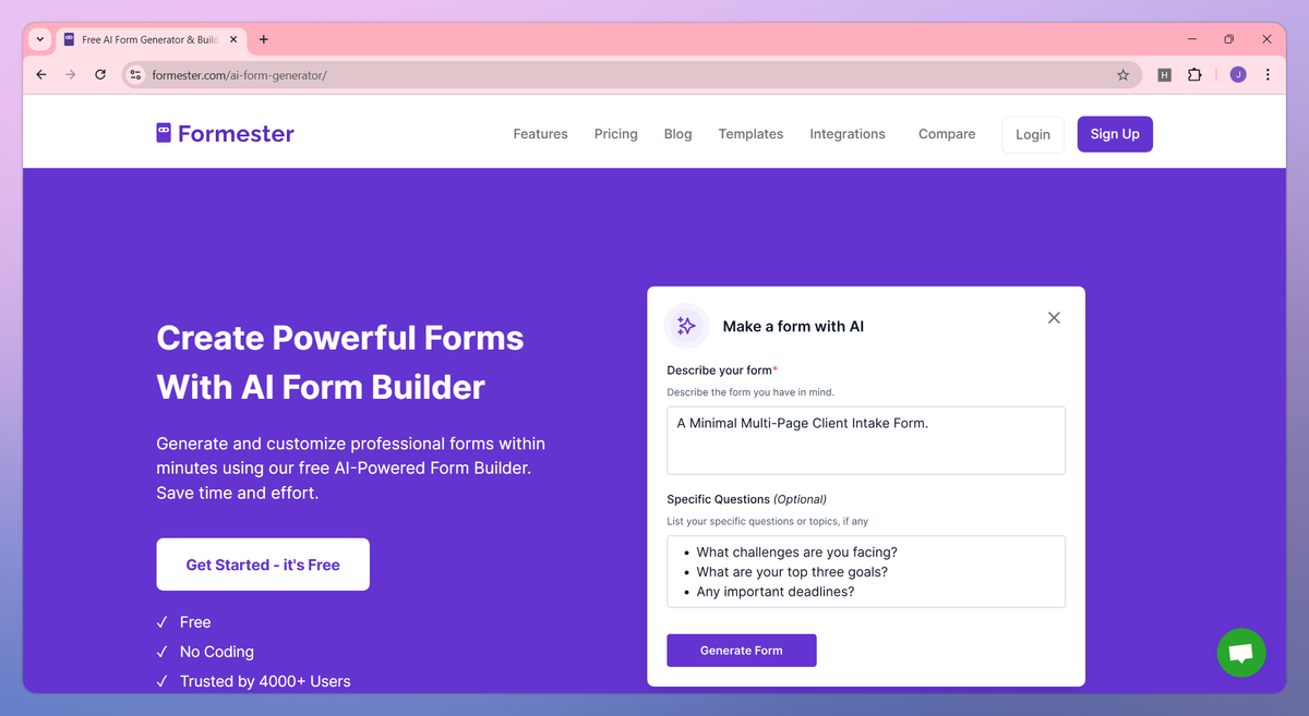 Formester is an AI-powered form generator that creates professional forms, quizzes, and surveys in minutes without coding. It offers multilingual translation into 80+ languages, applies AI spam protection, and includes drag-and-drop customization to help teachers build class quizzes, business owners collect customer feedback, and HR managers develop job application forms.