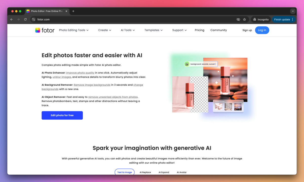 Fotor is an AI-powered photo editing and design platform for visual content creation. It removes backgrounds in seconds, generates images from text descriptions, and applies artistic effects to photos that helps photographers, designers, and social media managers produce professional-quality visuals without graphic design expertise.