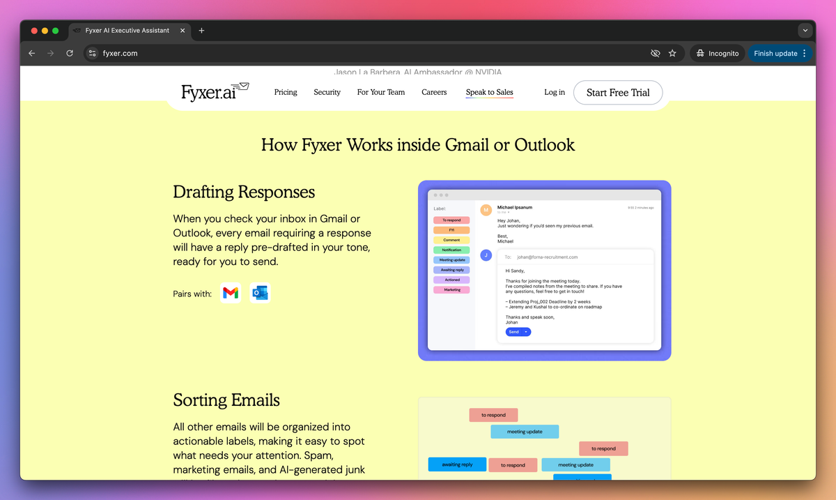 Fyxer AI is an AI-powered executive assistant that organizes your email inbox, writes personalized email responses, and generates meeting notes. It learns your writing style from past communications to draft contextual replies, sort messages into action-based categories, and create meeting summaries for busy professionals who want to reclaim time from inbox management.