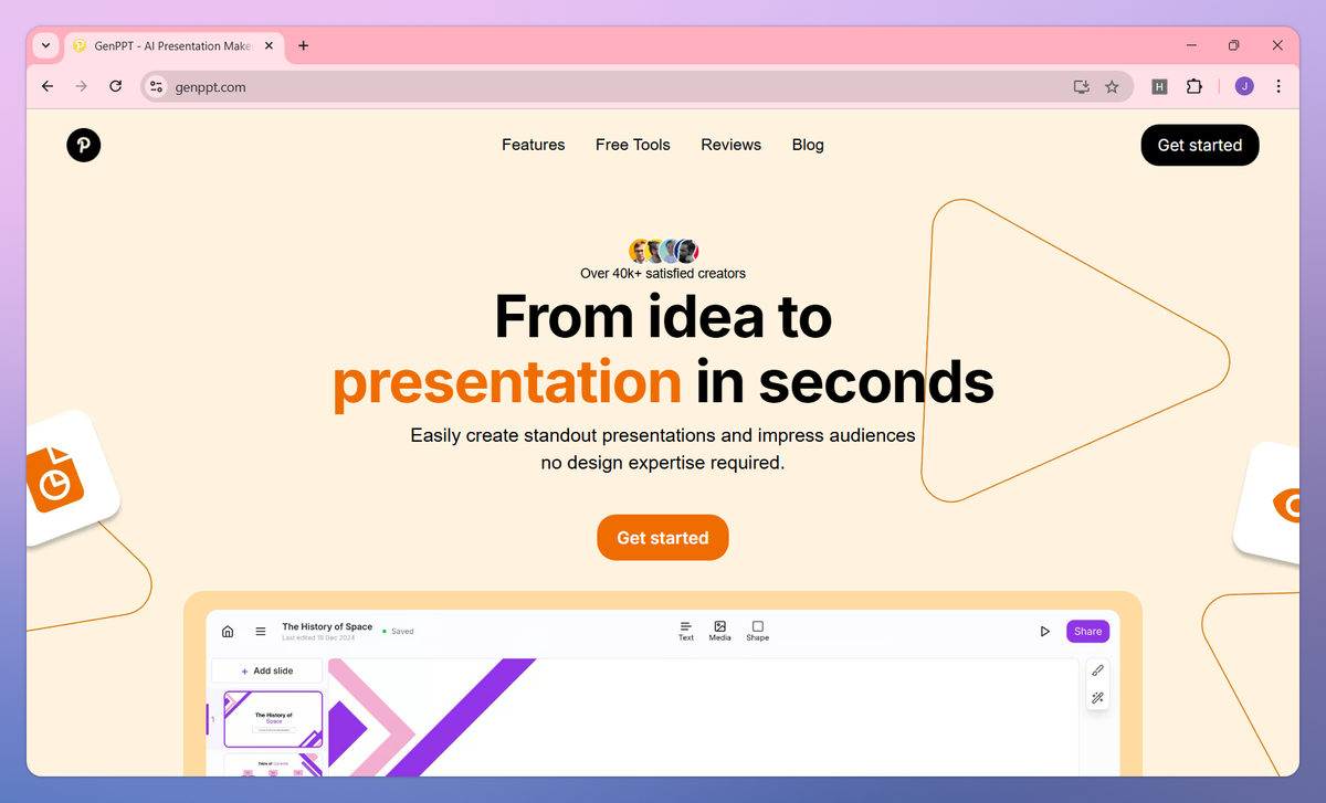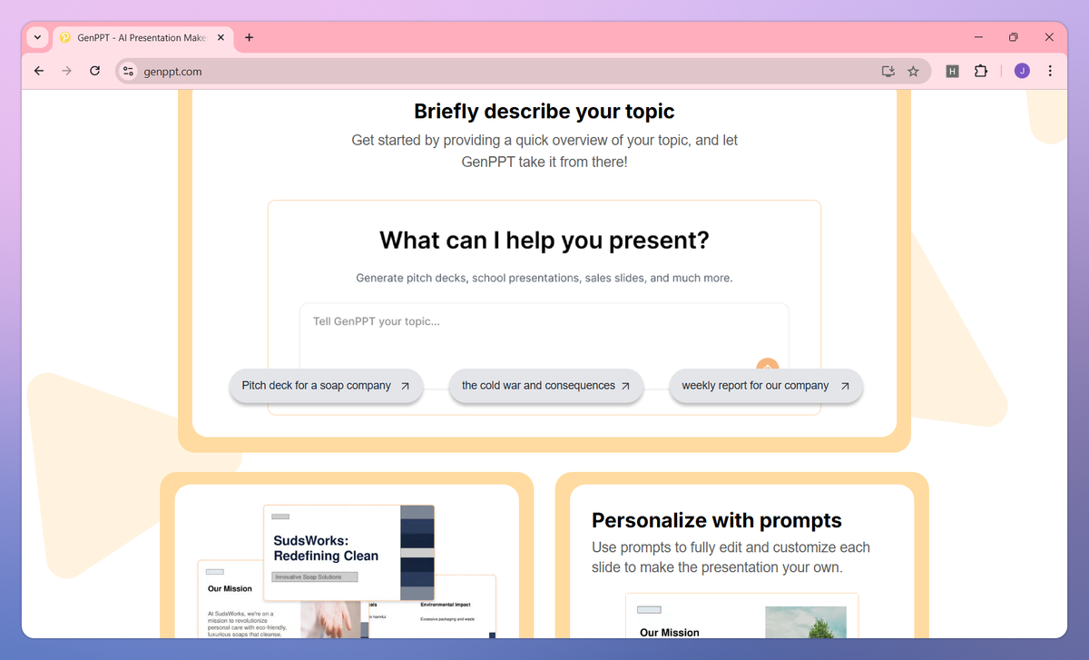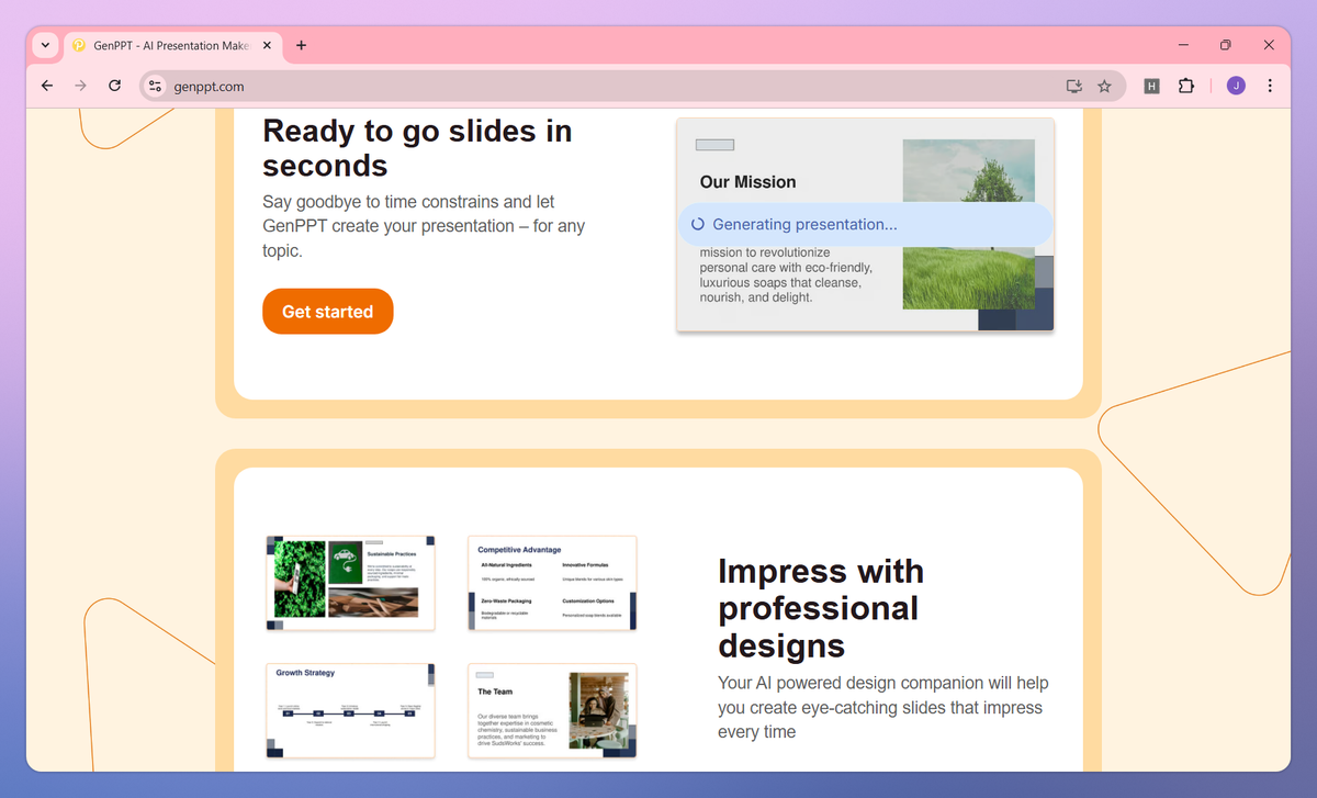 GenPPT is an AI-powered presentation maker that transforms text into structured PowerPoint slides, organizes content with perfect formatting, and enables team collaboration with export options. It helps business professionals, educators, and students create complete presentations in under two minutes without design expertise.