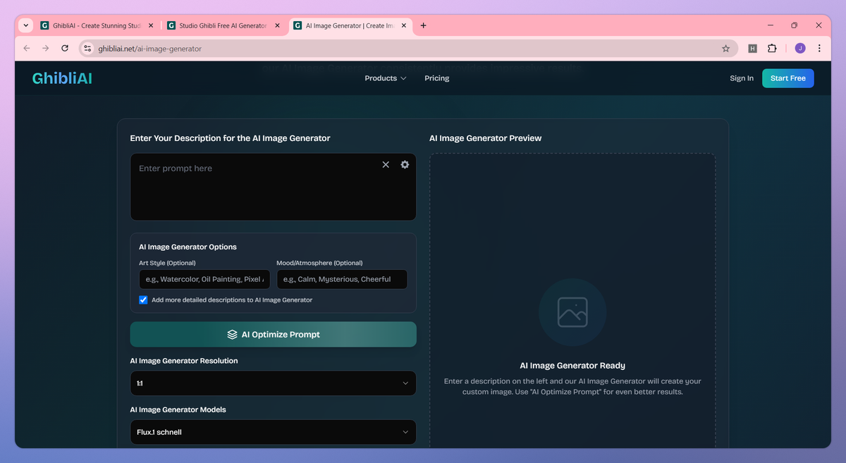 - Transform written descriptions into artwork with the distinctive Studio Ghibli aesthetic using specialized AI models trained on the iconic animation style.