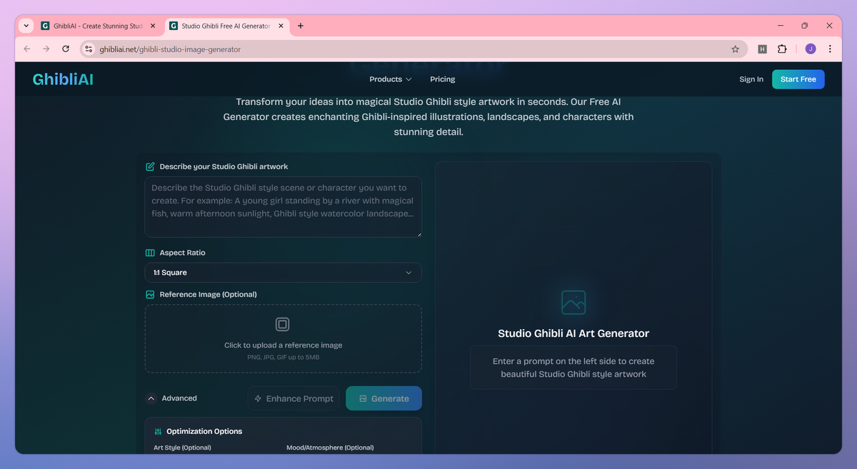 GhibliAI is an AI-powered art generator specialized in creating Studio Ghibli style artwork from text prompts or existing images. It converts descriptions into magical illustrations, transforms photos into authentic Ghibli-inspired visuals, and offers detailed style controls for lighting, color palette, and character design that help digital artists, animators, and game developers produce distinctive Miyazaki-inspired creations.