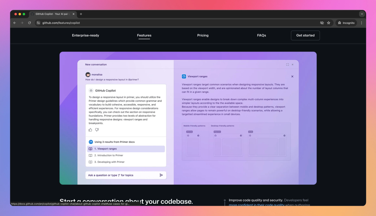 - GitHub Copilot provides personalized answers grounded in your organization’s documentation with inline citations.