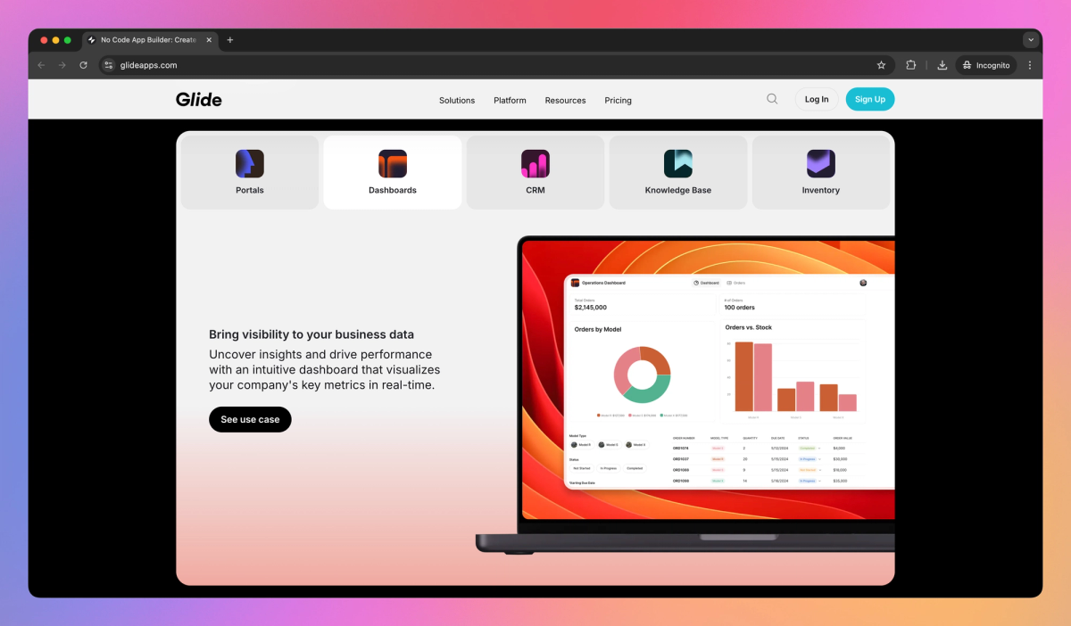 Glide allows business owners to create custom mobile and web apps without coding. The platform connects to existing data sources like spreadsheets and SQL databases, enabling operations managers to build tools for inventory tracking, sales pipeline management, and work order processing.
