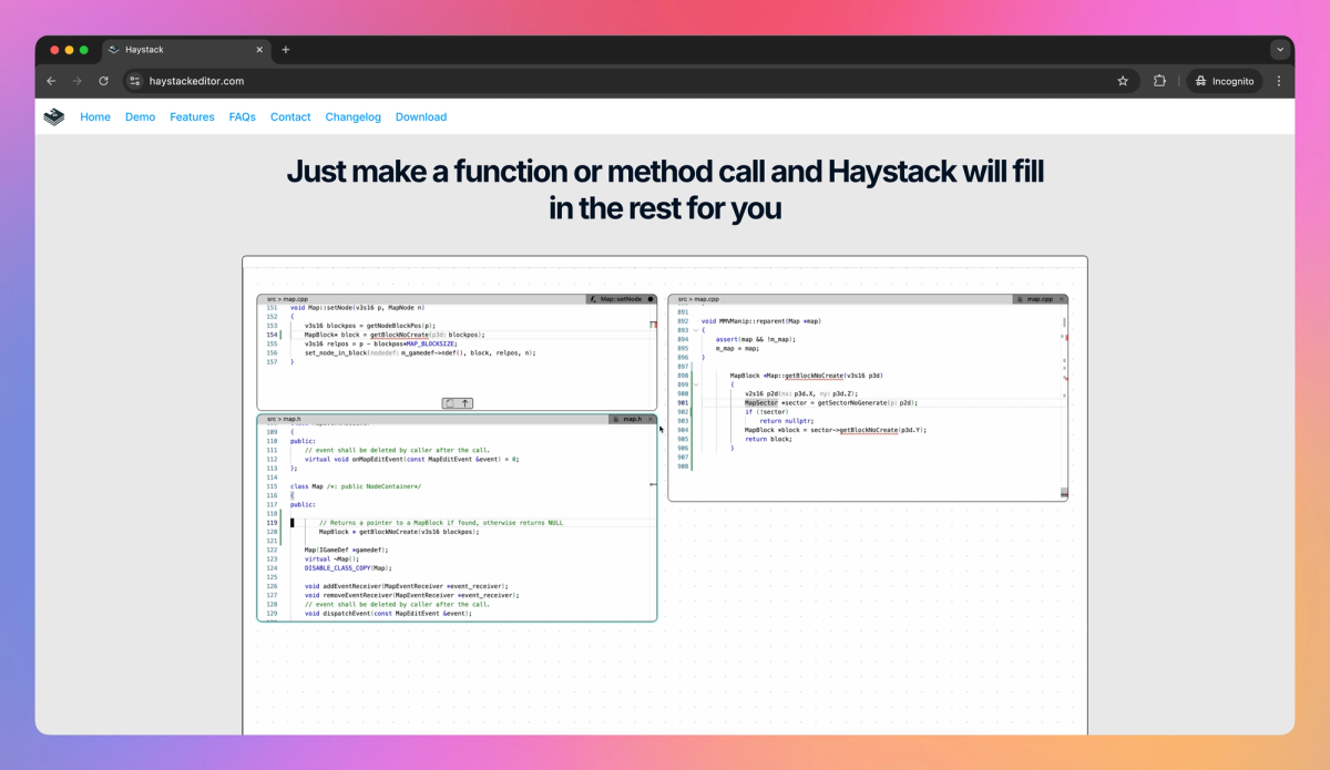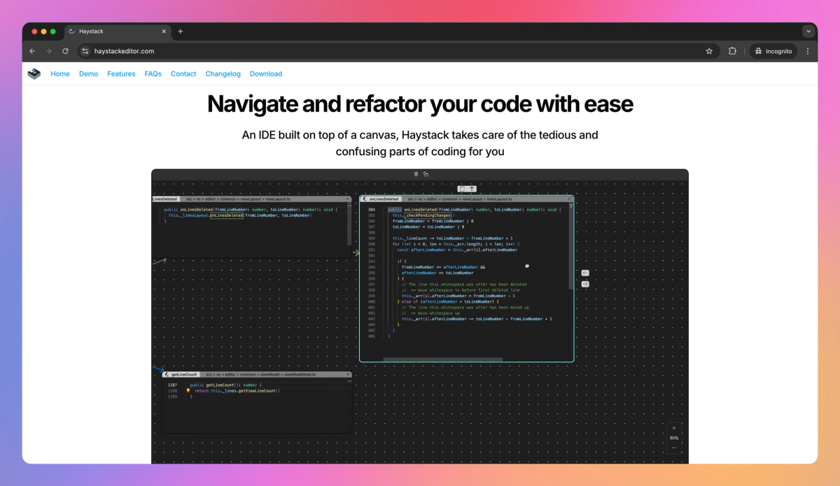 Haystack sets itself apart with its canvas-based IDE, which reimagines how developers interact with code. This approach proves particularly useful for programmers who often juggle multiple functions or methods, as it allows for a more visual and intuitive coding experience. By offering a unique way to navigate and refactor code, Haystack helps software engineers focus on solving complex problems rather than getting lost in code structure.