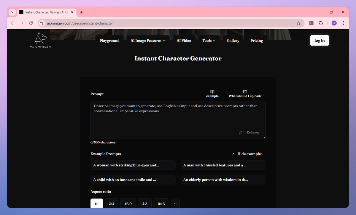 - Transform your character ideas into images with a straightforward four-step process: upload a photo, describe your vision, choose a format, and generate.