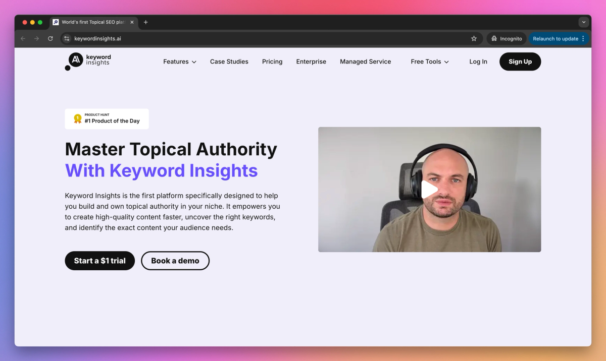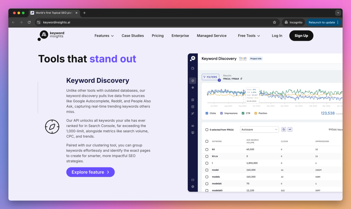 Keyword Insights sets itself apart with its machine learning analysis, which helps SEO agencies measure search intent and identify gaps in their content strategy within minutes. This approach to keyword planning saves marketing teams hours compared to manual clustering and competitor research methods. The built-in AI writing tools let content managers outline entire blog posts from any keyword group and turn those briefs into website articles.