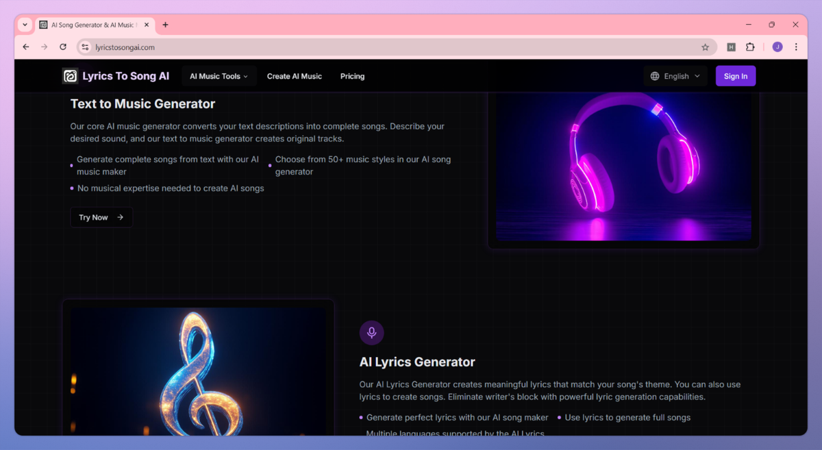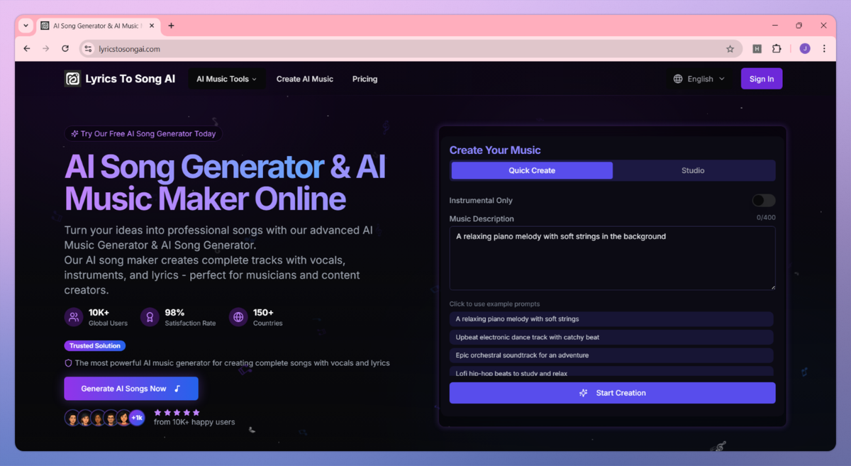 LyricsToSongAI sets itself apart with its dual-engine architecture that combines music generation and professional vocal separation in one integrated platform, eliminating the need for audio engineers to juggle multiple tools. This unified approach proves particularly beneficial for music producers and remix artists who can generate original tracks and then immediately extract clean vocal or instrumental stems for sampling and remixing projects. The platform delivers industry-grade separation accuracy of 90-95% while maintaining a single workflow that streamlines the entire creative process from concept to final track.