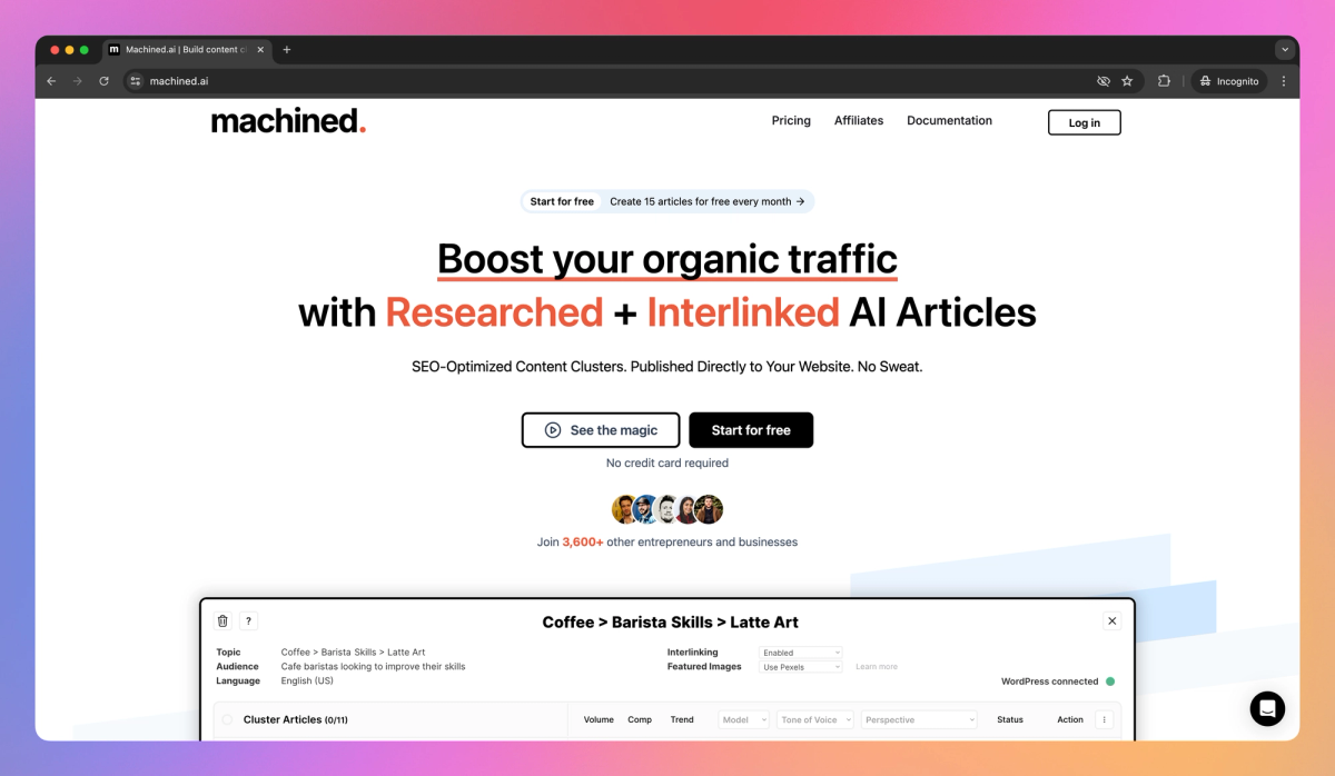 Machined sets itself apart by automating the entire content cluster creation process, from keyword research to article writing, for content marketers and SEO specialists. This approach is useful for website owners who want to build structured content without spending hours on manual research and writing. Machined's focus on creating interconnected content sets a new standard for how businesses approach their online presence.