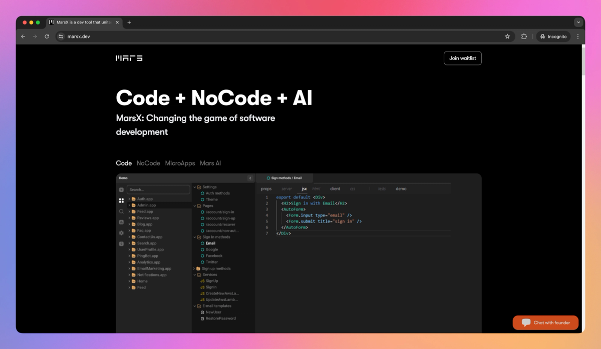 MarsX is an AI-driven software development platform that combines code, no-code, and pre-built MicroApps. It allows developers and entrepreneurs to create web and mobile applications by reusing expert-built components, helping startups launch projects faster and reduce development costs.