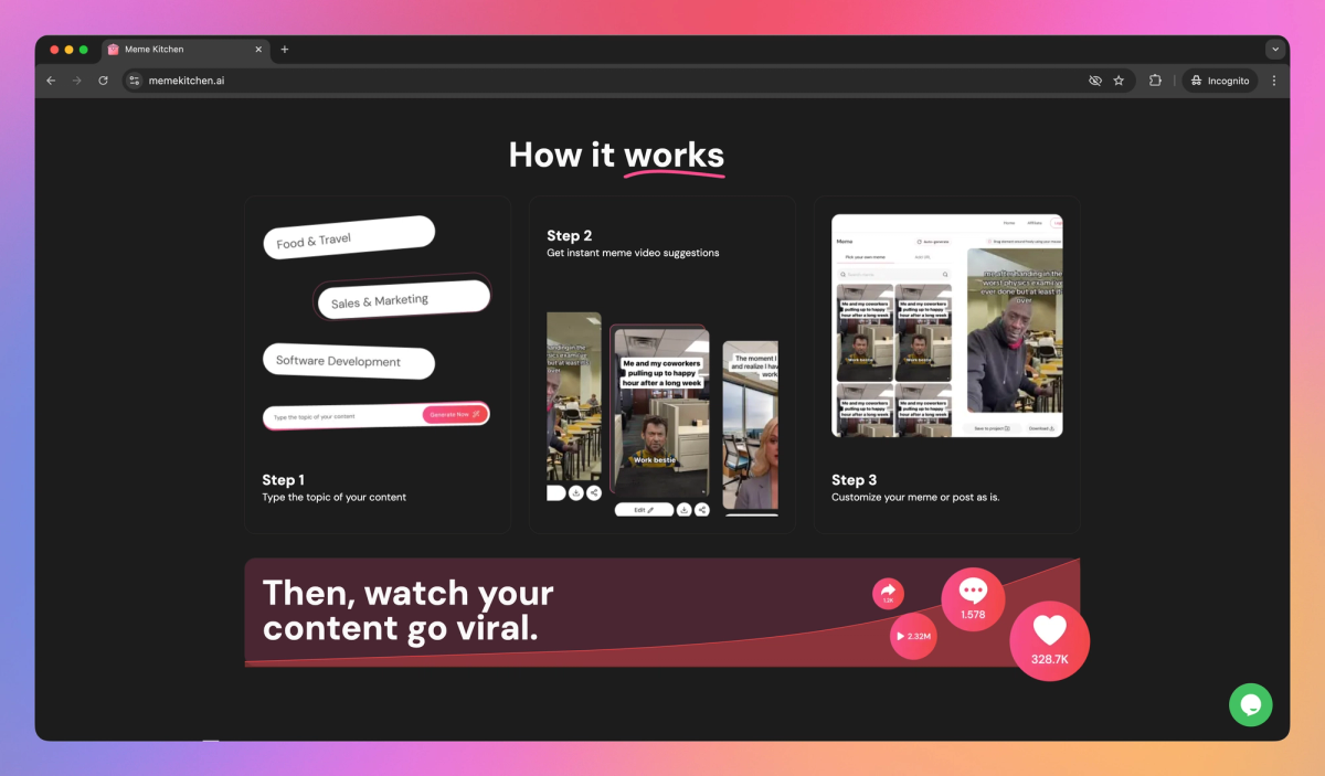 Meme Kitchen sets itself apart with its one-click meme video generator that turns trending topics into viral social media content in minutes. This rapid meme-making approach works well for small business owners and influencers who need fresh, relevant content to connect with their audiences. The platform's formula for turning everyday topics into shareable memes helps brands build deeper connections with their online communities.