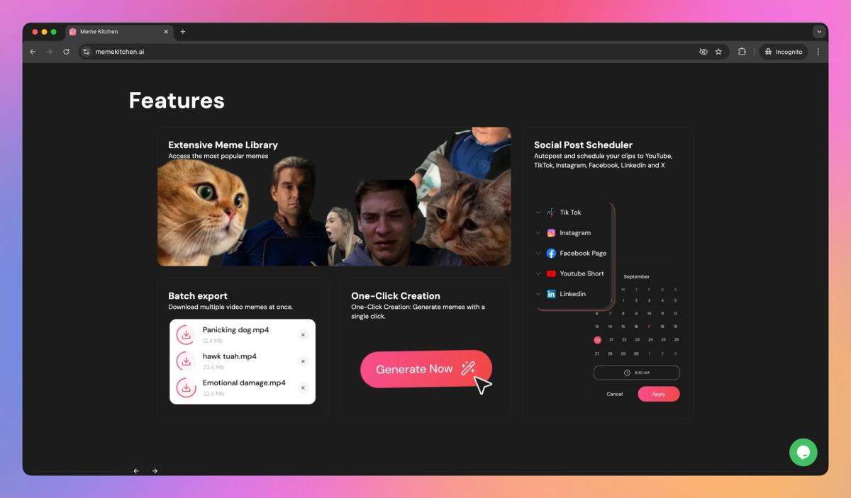 - Schedule and autopost memes directly to multiple platforms including YouTube, TikTok, Instagram, Facebook, LinkedIn, and X.