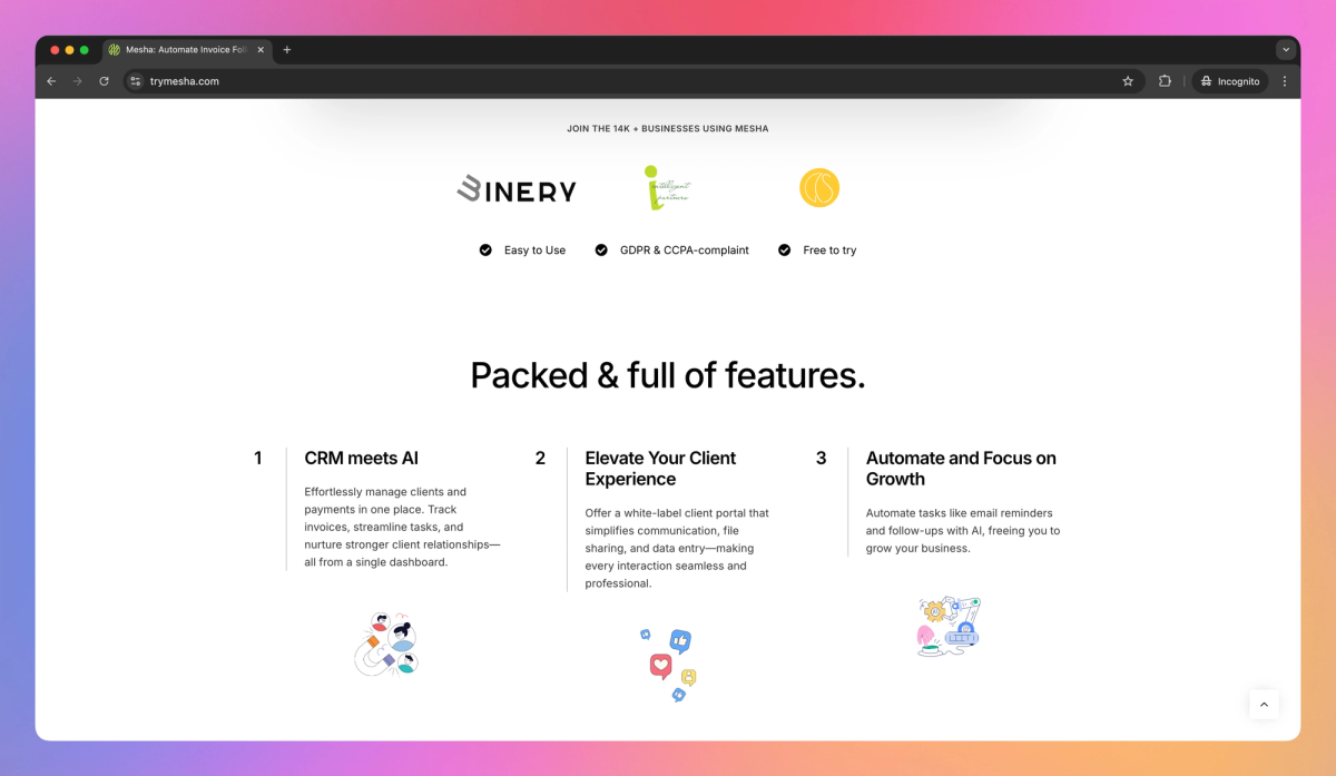 - Connect Mesha with popular billing, accounting, CRM, and communication tools to synchronize data across platforms.