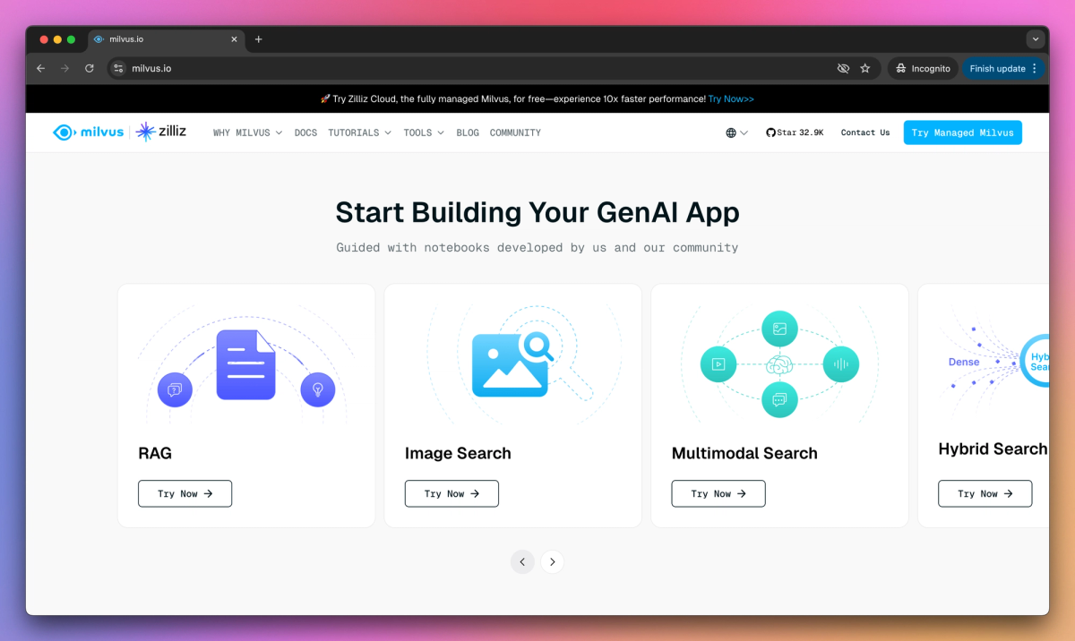 Milvus is an open-source vector database designed for similarity search in AI applications. It stores and indexes vector embeddings, performs high-speed similarity searches, and scales to billions of vectors to help data engineers and machine learning developers build efficient retrieval systems for applications like RAG, recommendation engines, and image search.