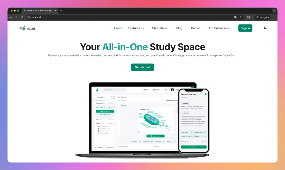 Monic.ai is an AI-powered study platform that helps students create quizzes, flashcards, and summaries from their course materials. It allows students to chat with their notes and study documents, providing instant answers and explanations to aid in exam preparation and information retention.