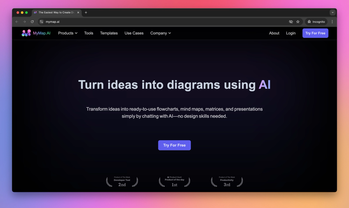 MyMap.AI transforms ideas into visual diagrams through an AI-powered chat interface. Project managers can upload files, integrate web search results, and collaborate in real-time to create project roadmaps.
